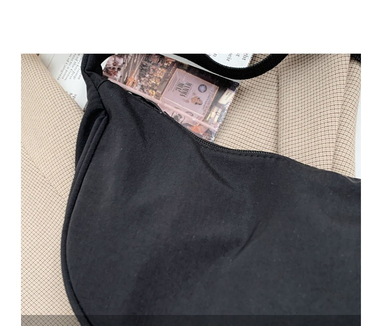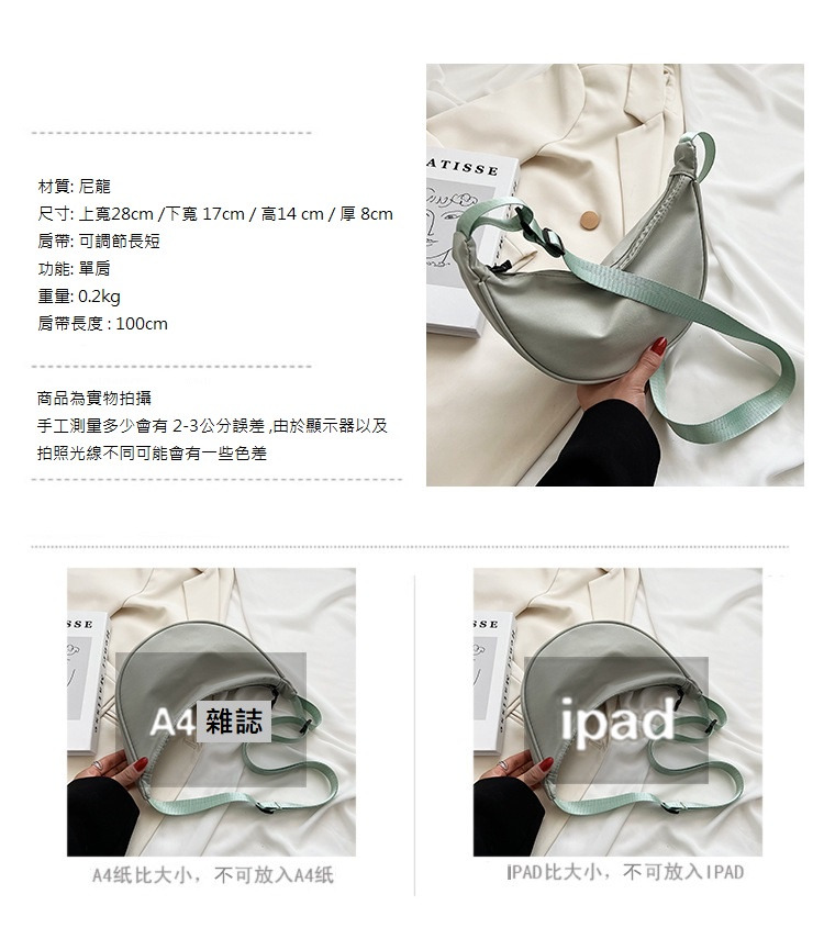 尼龍材質輕量防潑水,半月造型俏皮可愛。拉鍊開合方便取物,可單肩或斜背,日常出門逛街的輕便好選擇。多色可選,簡約低調中帶點個性。