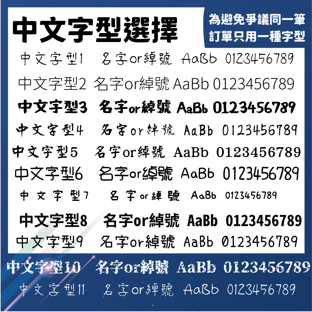 2. 刻字服務採自助式, 請參考商品圖片內容選擇字型, 要刻的字用 [ ] 括號標示,
