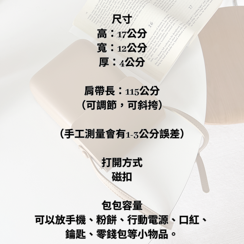 包包採用磁扣設計,開合便捷,容量充足,可輕鬆放入手機、氣墊、行動電源、口紅、鑰匙和卡包等小物品。